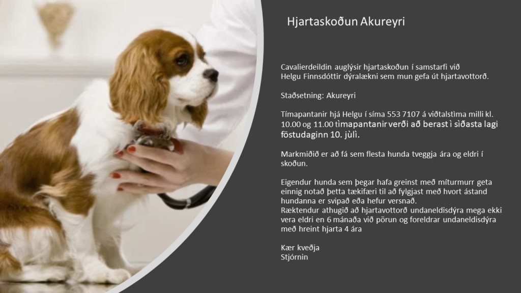 Hjartaskoðun á Akureyri 08/07/2020FréttirCavalier HRFI Á næstu dögum verður Helga Finnsdóttir dýralæknir stödd á Akureyri. Deila: Click to share on Facebook(Opnast í nýjum glugga) Facebook Líka við Hleð... Related