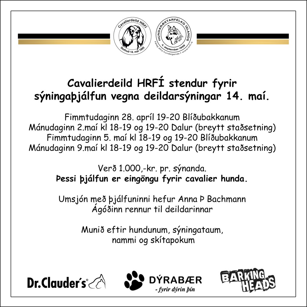 Sýningaþjálfun fyrir deildarsýninguna. 19/04/2022FréttirCavalier HRFI Deila: Click to share on Facebook(Opnast í nýjum glugga) Facebook Líka við Hleð... Related