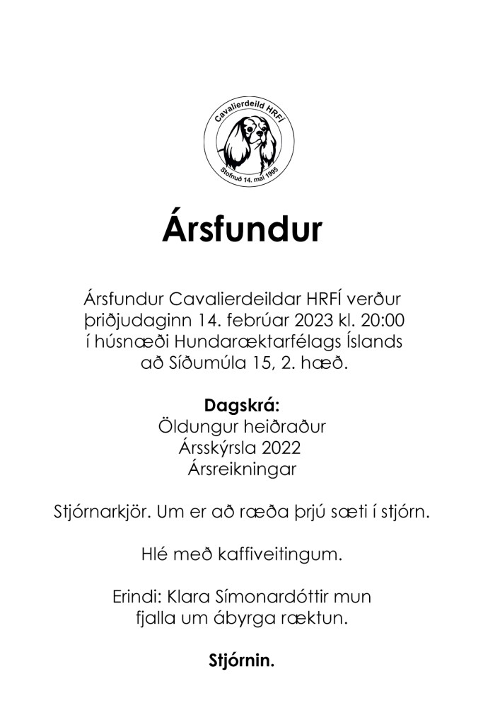 Ársfundur 06/02/2023Fréttir, ViðburðirCavalier HRFI Ársfundur Cavalierdeildar verður haldinn þriðjudaginn 14. febrúar kl. 20, í húsnæði HRFÍ að Síðumúla 15 (2. hæð). BH hönnun Deila: Click to share on Facebook(Opnast í nýjum glugga) Facebook Líka við Hleð... Related