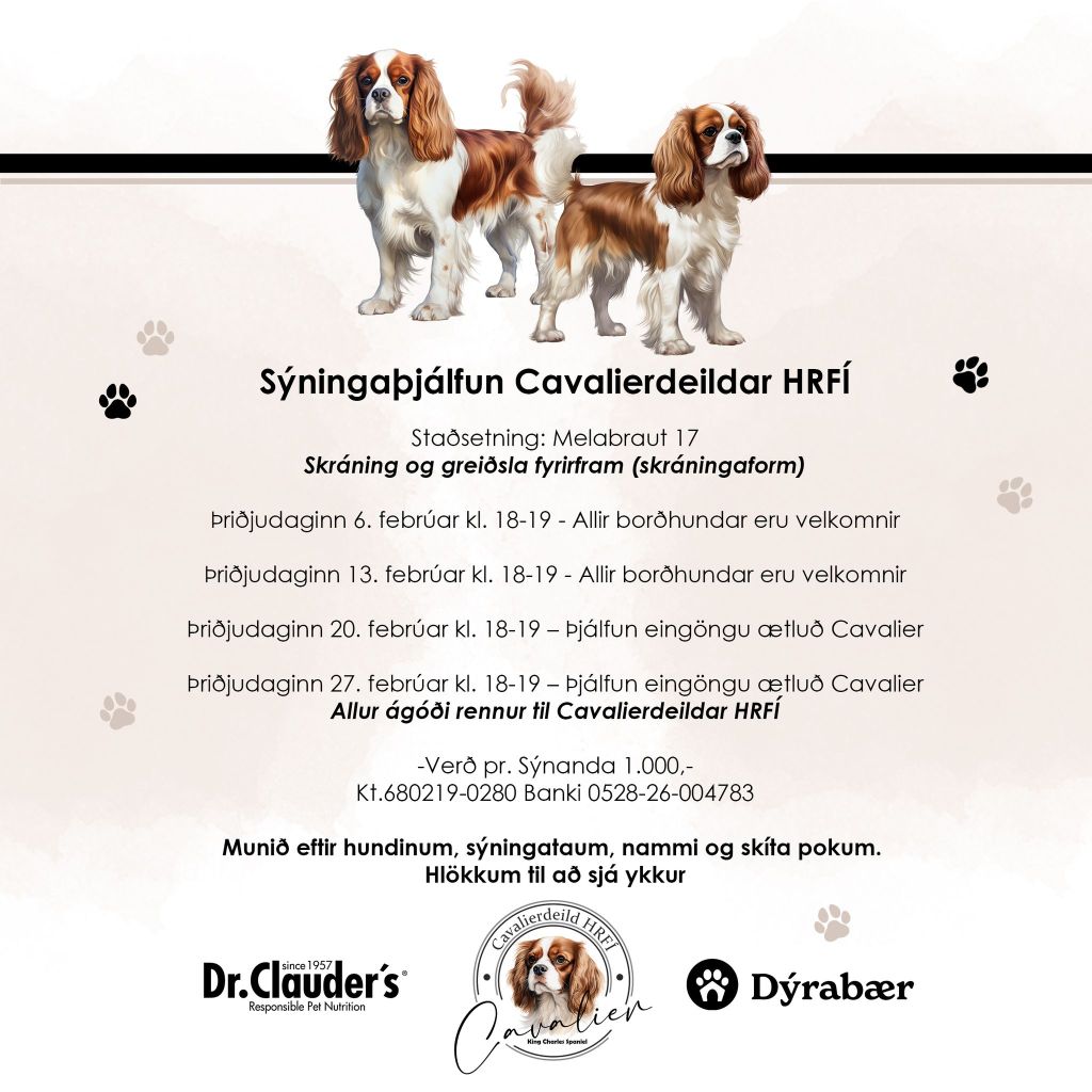Sýningaþjálfun 30/01/2024Fréttir, ViðburðirCavalier HRFI Skráning hér Deila: Click to share on Facebook(Opnast í nýjum glugga) Facebook Líka við Hleð... Related