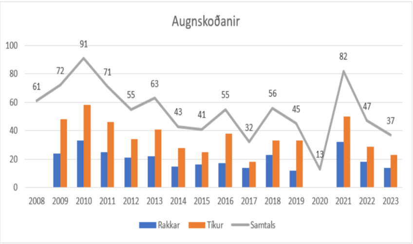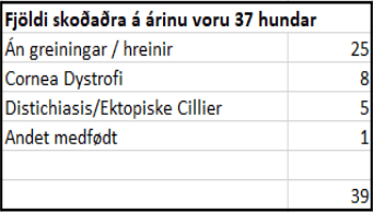 Skoðaðir voru 37 hundar á árinu, 23 tíkur og 14 rakkar. 25 hundar voru með hrein augnvottorð en 12 með athugasemdum sem skiptust upp í 14 mismunandi greiningar, sumir hundar með fleiri en eina.