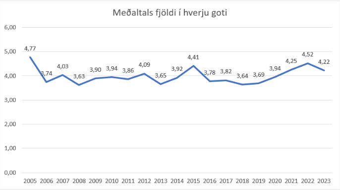 Fjöldi gota á árinu var 22 hjá 19 ræktendum. Meðalfjöldi hvolpa í goti var 4,22.