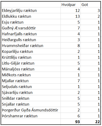 11 rakkar feðruðu þessi 22 got en hér má sjá lista yfir þá auk fjölda hvolpa og gota.