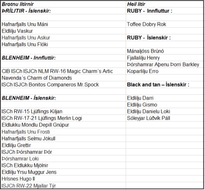 50 blenheim, 16 þrílitir, 18 ruby og 9 black & tan.