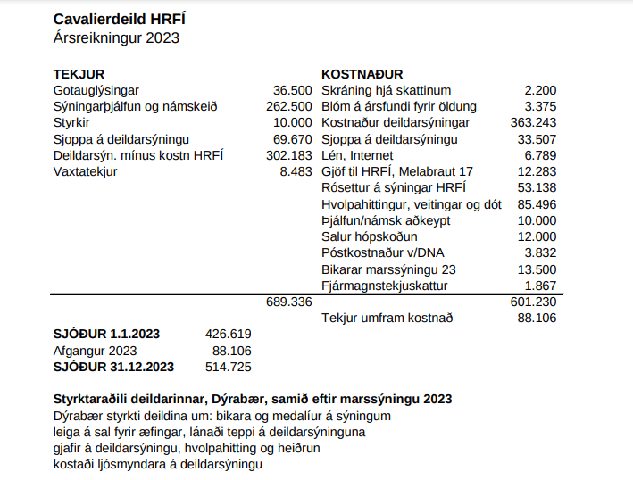 Stjórn vill einnig þakka þeim ræktendum sem auglýst hafa á síðu deildarinnar og í leiðinni styrkt deildina við að halda úti vefsíðunni cavalier.is. Einnig vil stjórn þakka fyrirtækjum og ræktendum sem styrkt hafa deildina á árinu bæði í tengslum við deildarsýningu, verðlaun á sýningum og svo aðra viðburði ársins. Þess má geta að deildin hefur fengið að gjöf til endurnýtingar fjölda bikara sem hafa nýst á árinu og þökkum við þær gjafir.