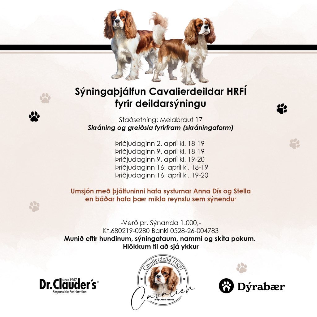 Sýningaþjálfun fyrir deildarsýningu 27/03/2024Fréttir, ViðburðirCavalier HRFI Skráning hér Deila: Click to share on Facebook(Opnast í nýjum glugga) Facebook Líka við Hleð... Related