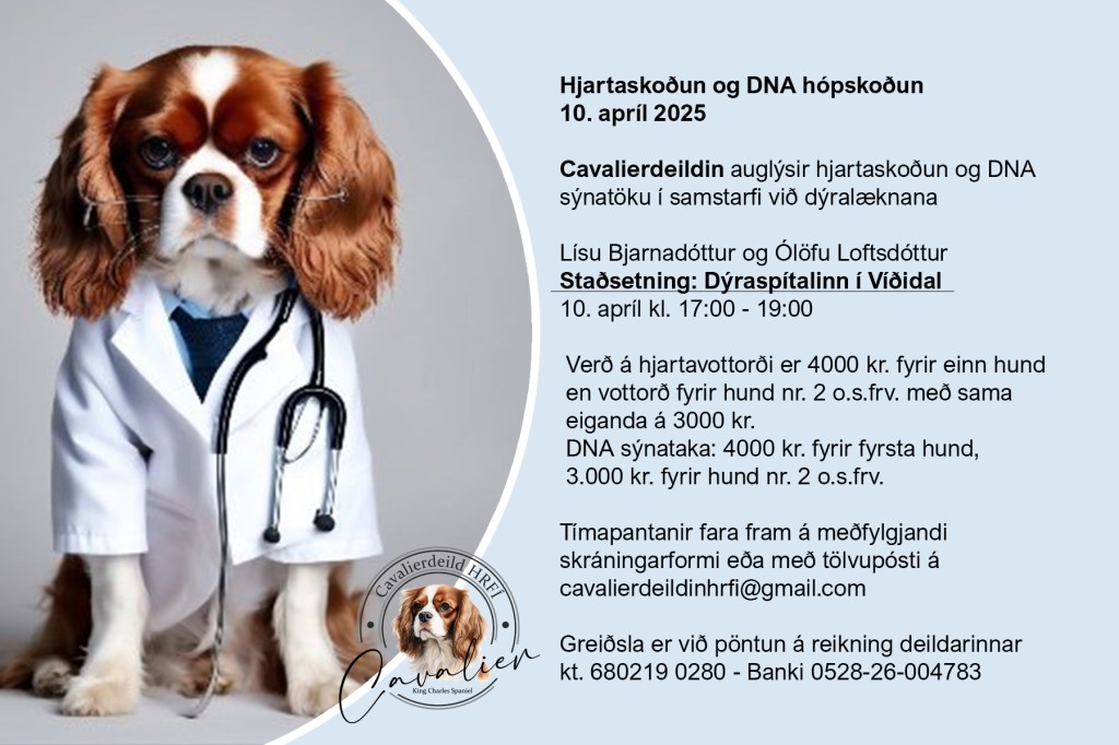 Hópskoðun 02/04/2025FréttirCavalier HRFI Skráning hér Athugið að fyrir DNA sýnatöku þarf að panta gögn frá Labogen fyrir tímann og koma með blöðin útprentuð. DNA er pantað hér Deila: Click to share on Facebook(Opnast í nýjum glugga) Facebook Líka við Hleð... Related