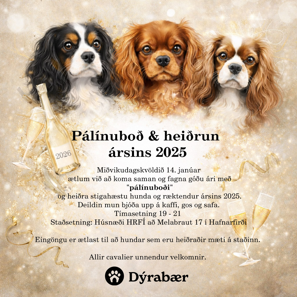 Pálínuboð og heiðrun sýningaársins 2025 07/01/2026Fréttir, ViðburðirCavalier HRFI Linkur á Facebook viðburð Deila: Click to share on Facebook(Opnast í nýjum glugga) Facebook Líka við Hleð... Related
