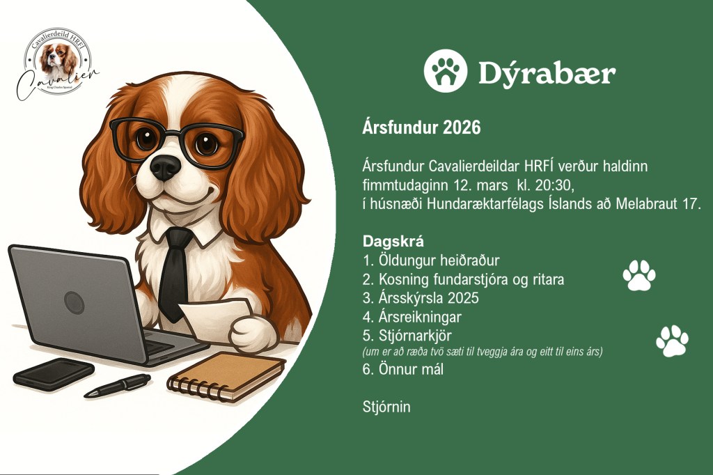 Ársfundur Cavalierdeildar HRFÍ verður haldinn fimmtudagskvöldið 12. mars kl. 20:30 í húsnæði HRFÍ að Melabraut 17 í Hafnarfirði.