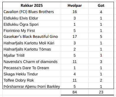 13 rakkar feðruðu þessi 23 got en hér má sjá lista yfir þá auk fjölda hvolpa og gota.