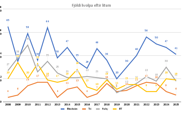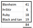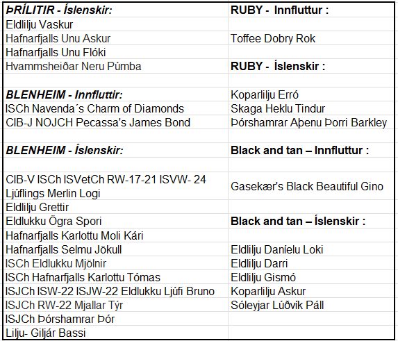 41 blenheim, 6 þrílitir, 18 ruby og 19 black & tan.