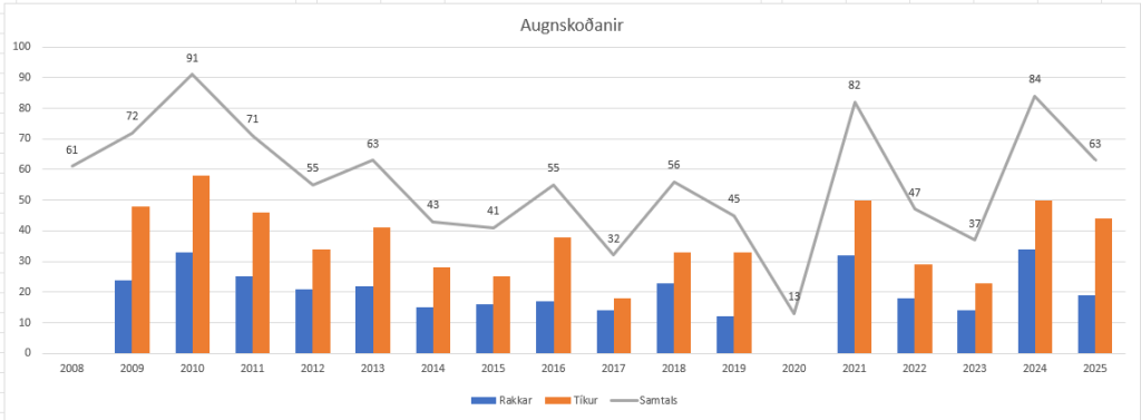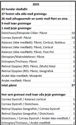 Skoðaðir voru 63 hundar á árinu, 44 tíkur og 19 rakkar. 37 hundar voru með hrein augnvottorð en 26 með athugasemdum sem skiptust upp í 11 mismunandi greiningar, sumir hundar með fleiri en eina og einn með þrjár greiningar.