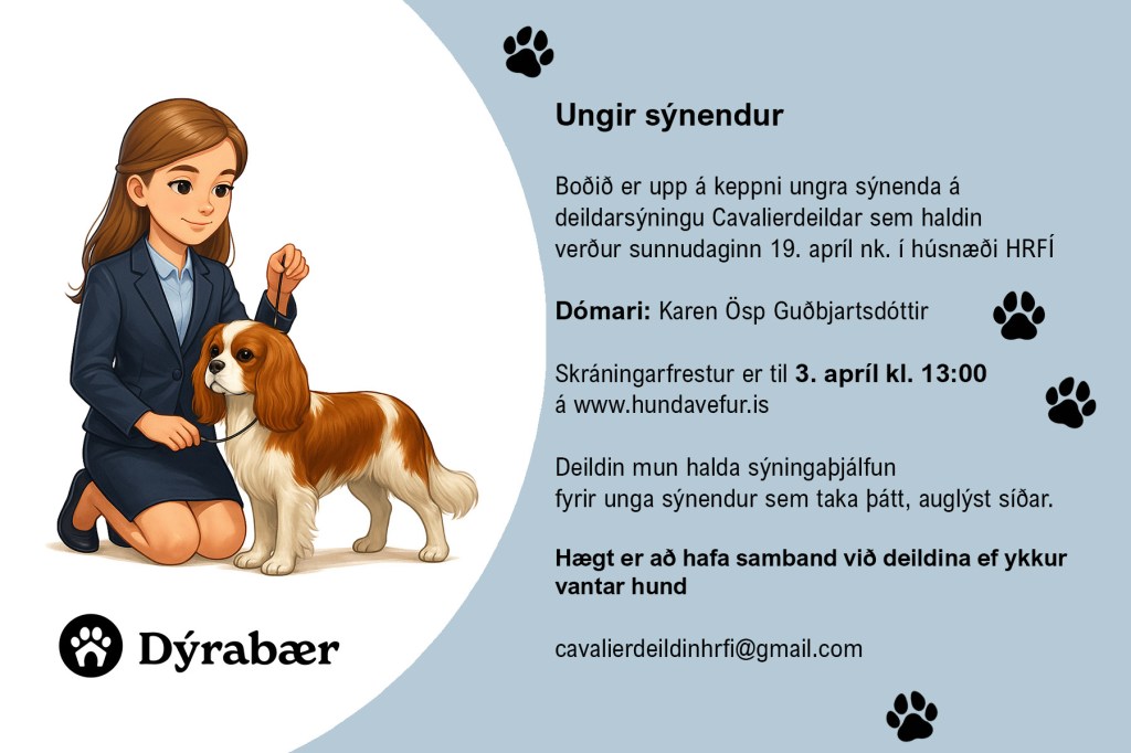 Ungir sýnendur á deildarsýningu 20/03/2026Fréttir, ViðburðirCavalier HRFI Skráning hér Deila: Deila á Facebook(Opnast í nýjum glugga) Facebook Líka við Hleð... Related
