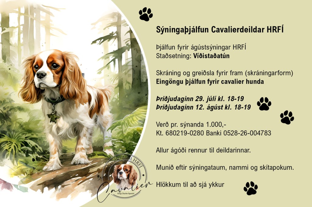 Nú um helgina 4.-5. október fer fram alþjóðleg sýning HRFÍ í reiðhöllinni í Víðidal. Cavalierdeild hefur sett upp kynningarbás í anddyrinu og verður básinn uppi alla helgina. Á sunnudeginum á milli kl. 10 og 14 verða einnig fulltrúar deildarinnar ásamt hundum á staðnum og því hægt að fá cavalierknús og svör við spurningum. Hvetjum öll áhugasöm um tegundina að kíkja við.