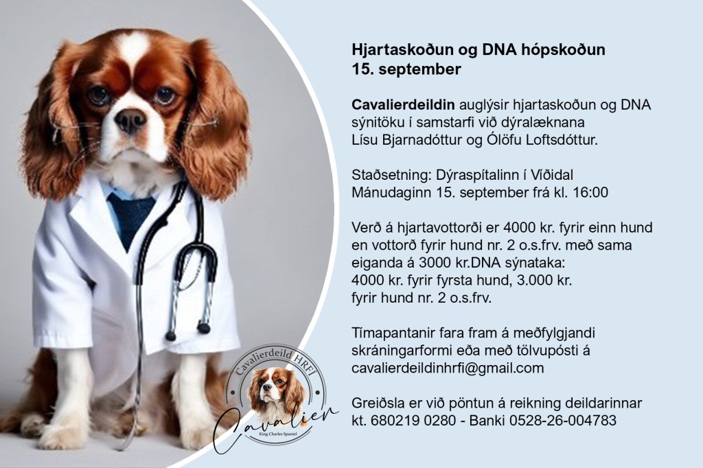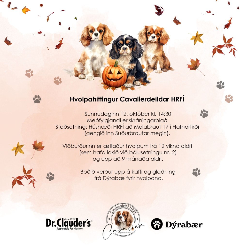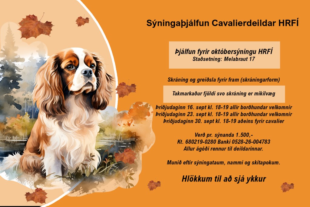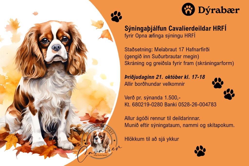 Nú um helgina 4.-5. október fer fram alþjóðleg sýning HRFÍ í reiðhöllinni í Víðidal. Cavalierdeild hefur sett upp kynningarbás í anddyrinu og verður básinn uppi alla helgina. Á sunnudeginum á milli kl. 10 og 14 verða einnig fulltrúar deildarinnar ásamt hundum á staðnum og því hægt að fá cavalierknús og svör við spurningum. Hvetjum öll áhugasöm um tegundina að kíkja við.