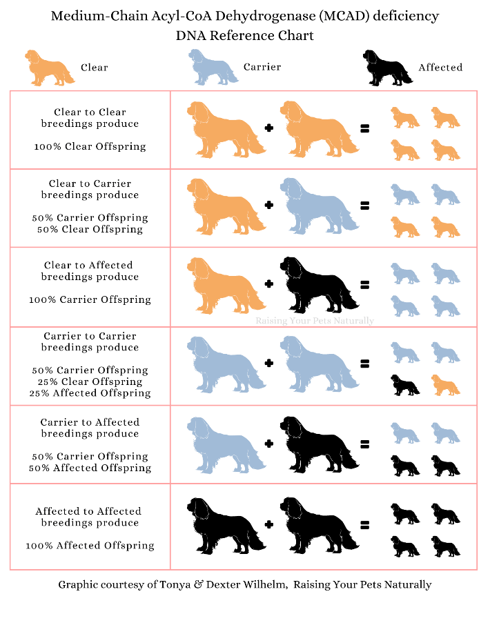 Það þarf ekki að taka MCADD hunda sem eru einkennalausir úr ræktun heldur þarf að passa að para þá við hreina hunda til að búa ekki til fleiri MCADD.